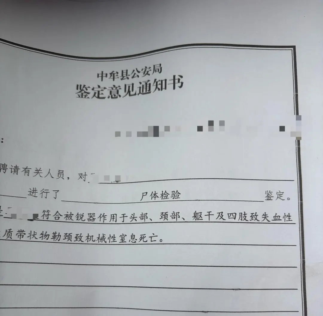 梁先生向记者提供的由中牟县公安局给出的《鉴定意见通知书》显示,其妻小霞符合被锐器作用于头部、颈部、躯干等多处,并有软质带状物勒颈致窒息死亡;其子也同样被锐器作用于头部、颈部、躯干等多处,致左侧肾动脉、横结肠破裂等,最终致急性失血休克死亡;其女则被他人用软质带状物勒颈窒息死亡。
