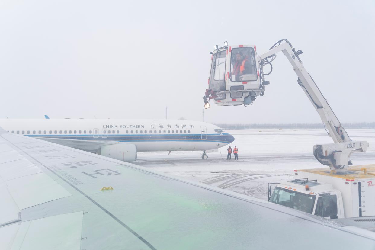 12月23日,工作人员在哈尔滨太平国际机场对飞机进行除冰除雪作业。新华社记者 谢剑飞 摄