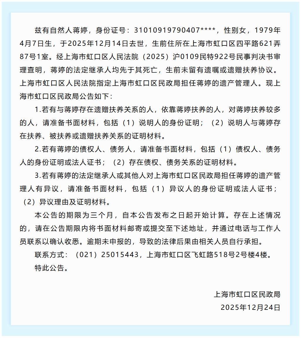 兹有自然人蒋婷,身份证号:31010919790407****,性别女,1979年4月7日生,于2025年12月14日去世,生前住所在上海市虹口区四平路621弄87号1室。经上海市虹口区人民法院(2025)沪0109民特922号民事判决书审理查明,蒋婷的法定继承人均先于其死亡,生前未留有遗嘱或遗赠扶养协议。上海市虹口区人民法院指定上海市虹口区民政局担任蒋婷的遗产管理人。现上海市虹口区民政局公告如下: