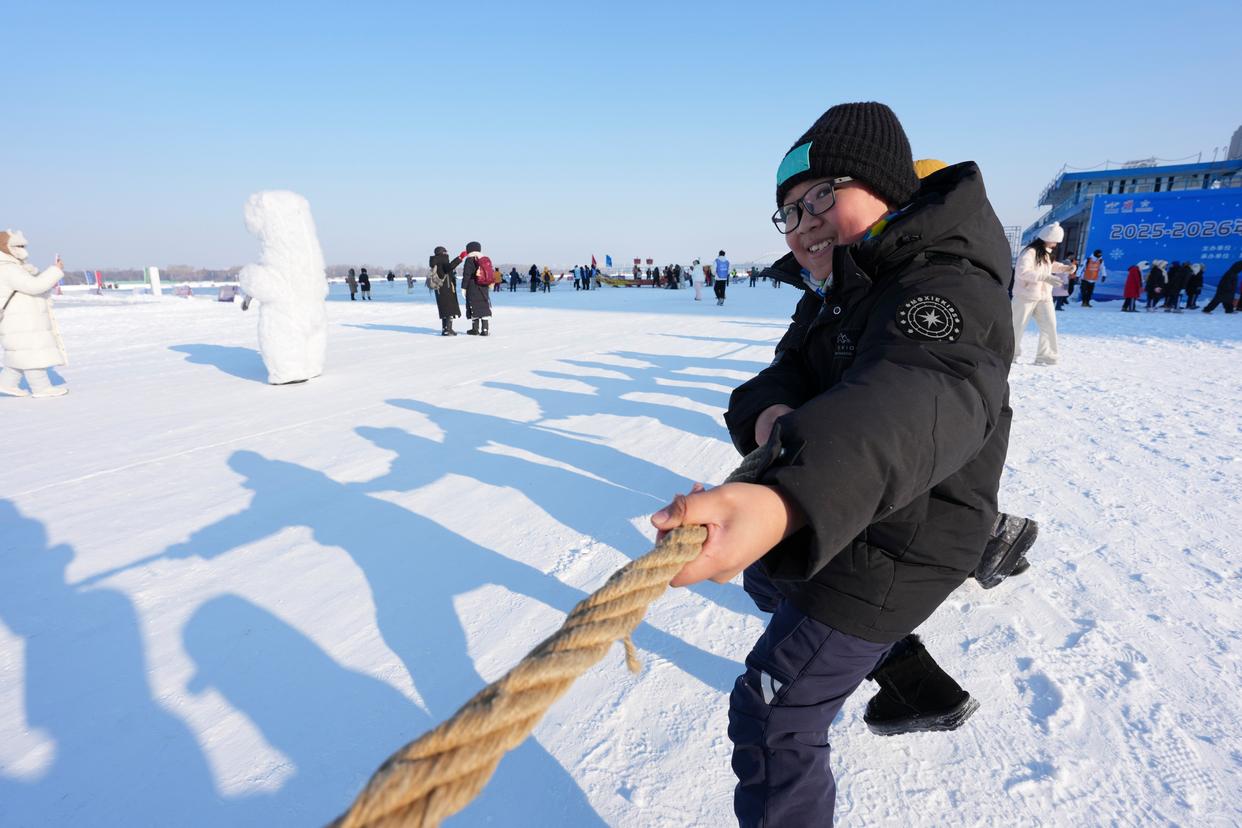 12月25日,小朋友在2026第八届哈尔滨松花江冰雪嘉年华园区内体验冰上拔河。新华社记者 王松 摄