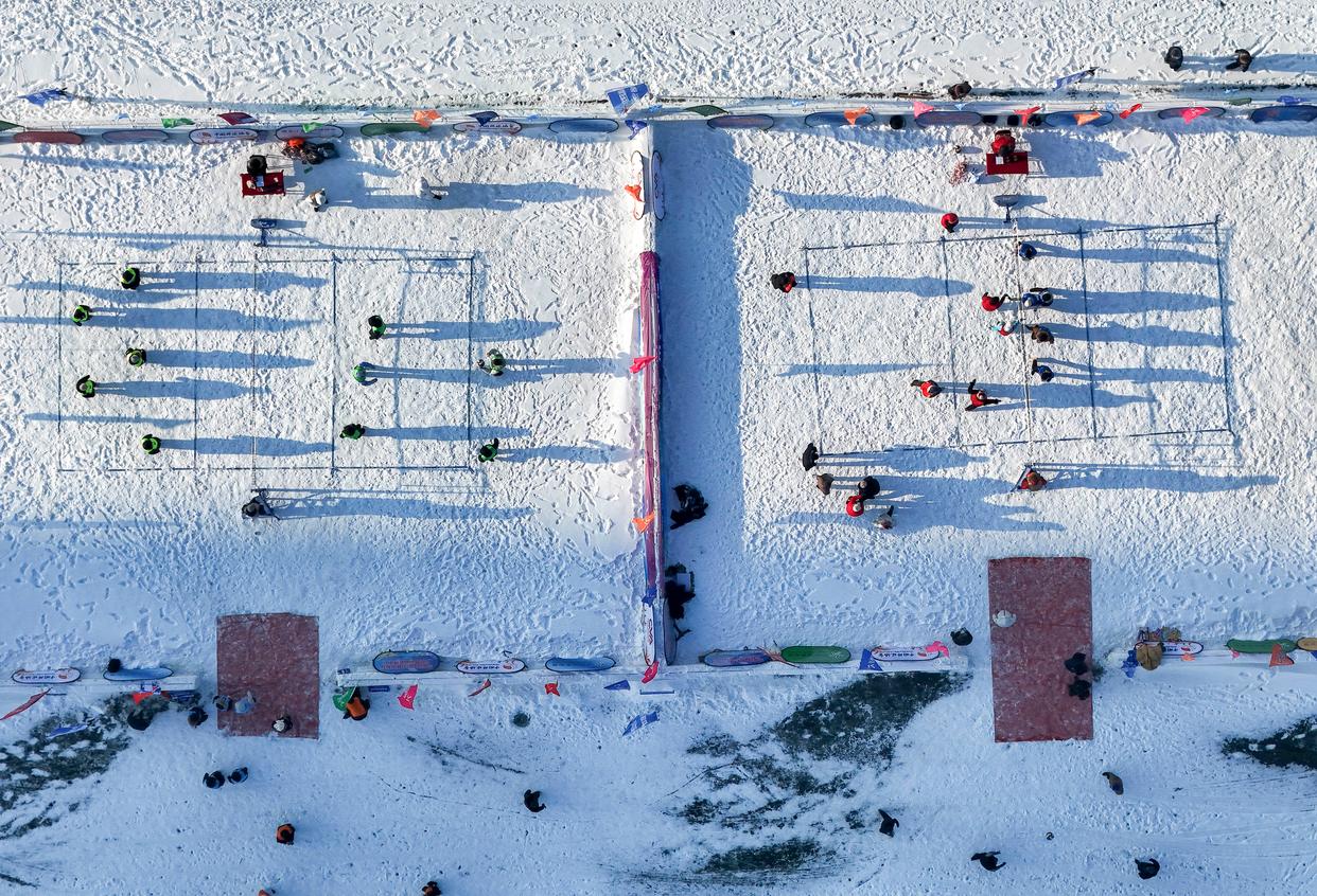 12月25日,人们在2026第八届哈尔滨松花江冰雪嘉年华园区内体验冰上排球(无人机照片)。新华社记者 王松 摄