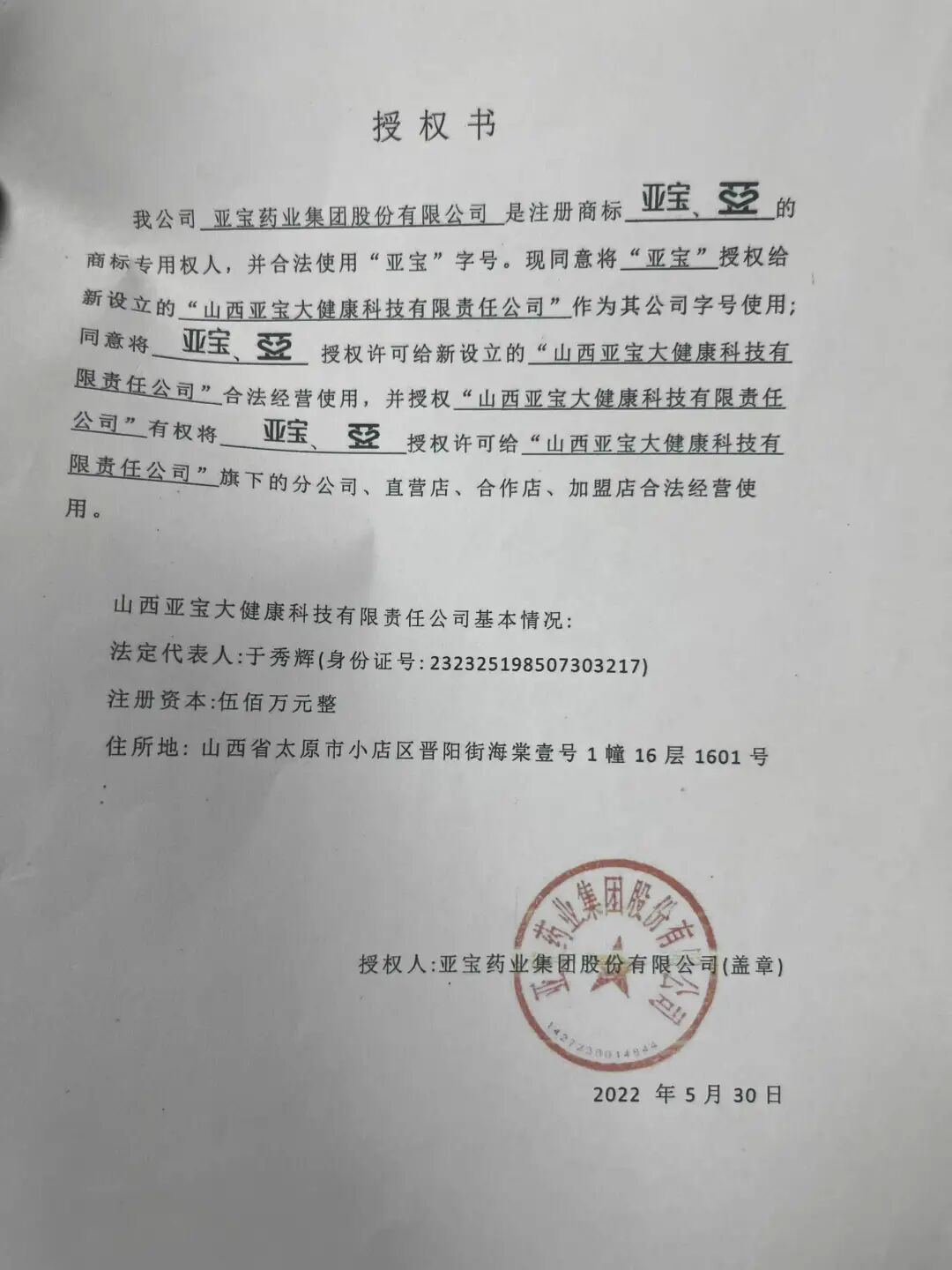店内出示的授权书显示:亚宝药业集团股份有限公司将“亚宝”授权给“山西亚宝大健康科技有限责任公司”,后者又授权给“深圳市宝安区丽丽家纺店”使用。