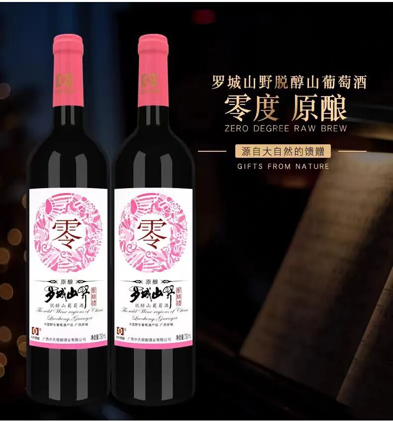 中天领御旗舰店销售的一款标称广西中天领御酒业有限公司生产的“罗城山野脱醇山葡萄酒”,包装正面有一个大大的“零”字,购买链接页面上也宣称“零度,原酿”。然而产品标签显示,该葡萄酒酒精度实际为0.5%vol。