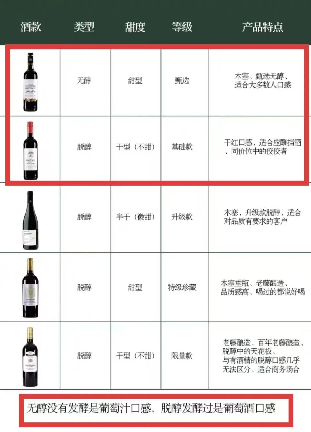 针对无醇葡萄酒和葡萄汁的区别,有商家提醒,葡萄汁产品中的葡萄未经发酵直接压榨灌装,口感和外观类似葡萄汁,糖分未经发酵,含糖量和热量普遍较高。而脱醇后的无醇葡萄酒保留了葡萄酒原有香气和特点,含糖量和热量普遍较低。