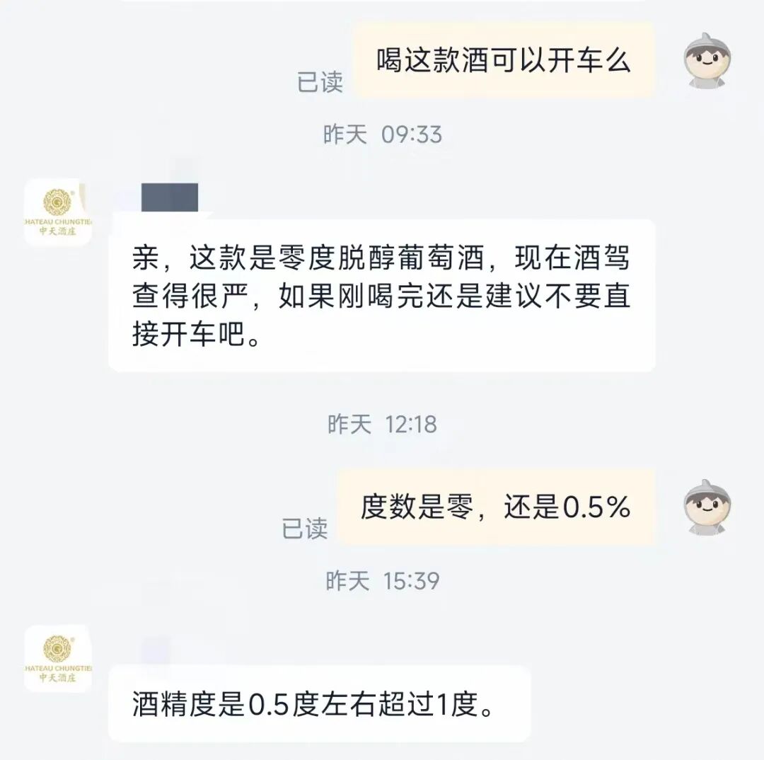 据客服介绍,“这款零度脱醇葡萄酒在生产过程中把酒中的酒精脱醇出来,酒精度只有不到1度,口感还是保留葡萄酒原有的风味,酸甜适中”。然而有买家留言反馈,该产品口感发酸,味道一般,没有酒味,更像是果汁的味道,类似酸梅汁。对于饮用后能否开车,客服依然称其产品为零度脱醇葡萄酒,并称“现在酒驾查得很严,如果刚喝完还是不建议直接开车”。