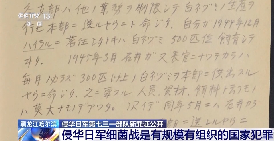 侵华日军第七三一部队罪证陈列馆宣传教育与陈列部主任 金士成:这份笔供中明确写到1945年6月东京方面要求停止细菌战的计划,从这我们就可以看到,侵华日军第七三一部队的细菌战计划是日本自上而下、有规模、有组织的国家犯罪,是由东京来下达指令的,而不是侵华日军第七三一部队一支部队所为。