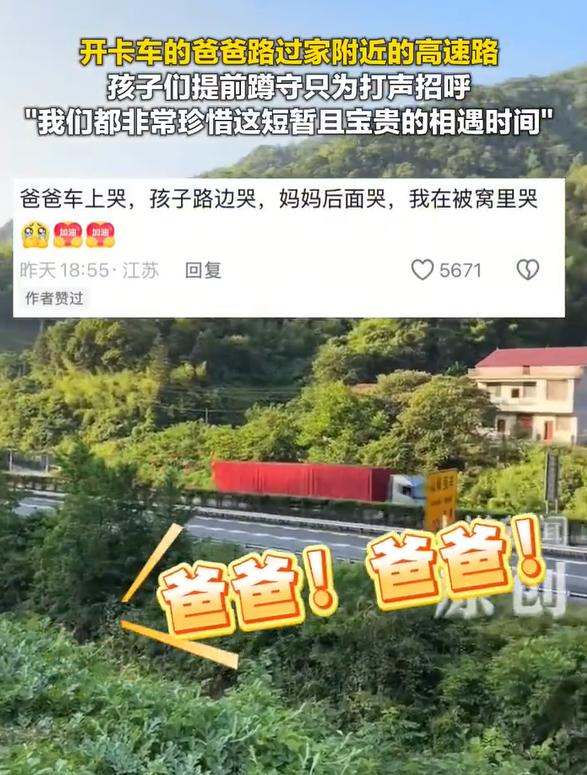 近日湖南一位卡车司机经过家附近高速时,与孩子们完成了一次特别的“双向奔赴”——孩子们提前蹲守路边,只为隔窗喊一声“爸爸”,而他鸣笛回应作为问候。
