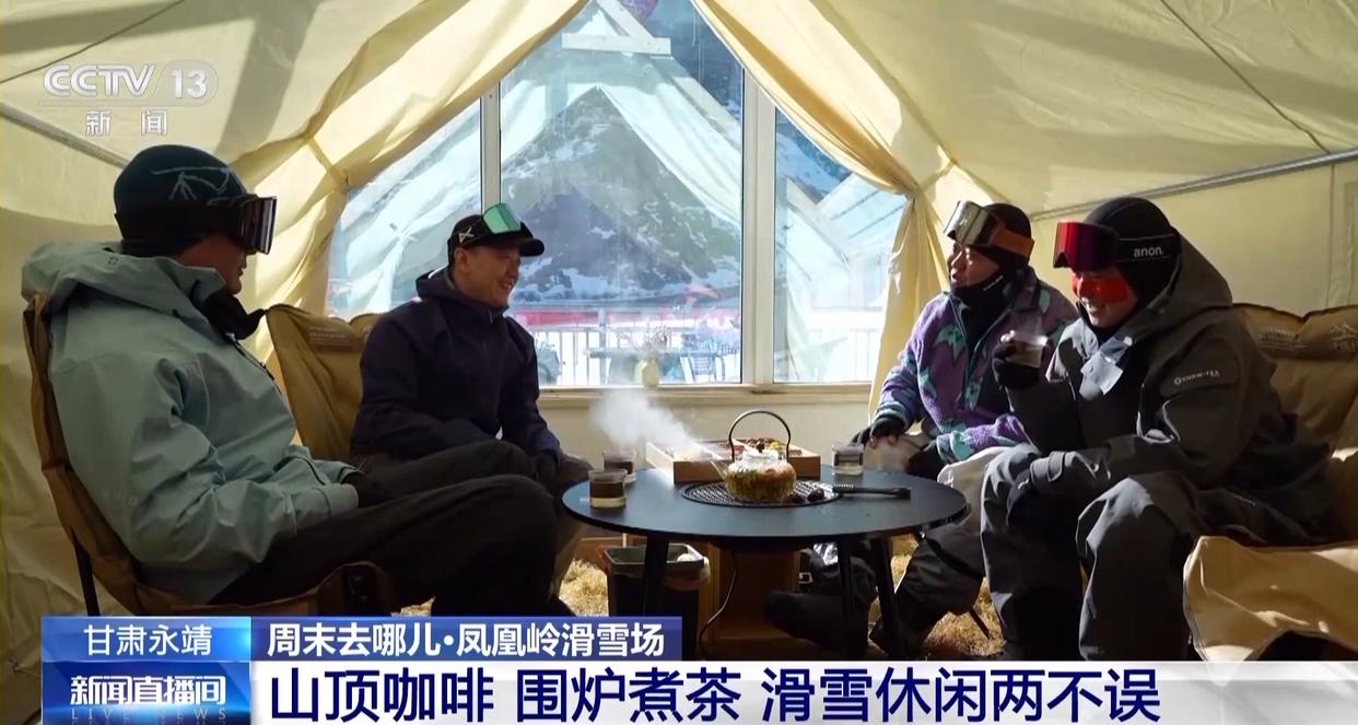 如果想找个更暖和的地方歇脚,山脚下的“围炉煮茶 ”区域绝对是首选!在休息区,雪场搭起了露营帐篷,里面摆着桌椅,还备上了甘肃特色的“三泡台”。约上三五好友,大家可以坐在帐篷里一边喝茶,一边欣赏着窗外的雪景,非常轻松惬意。