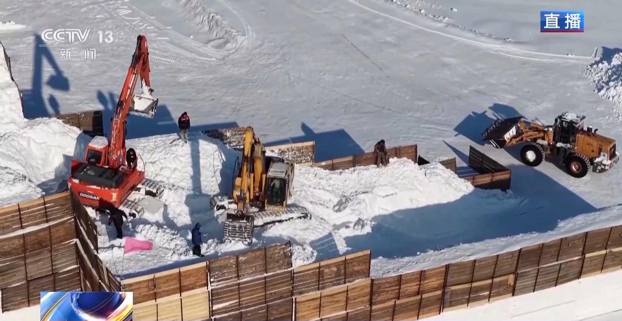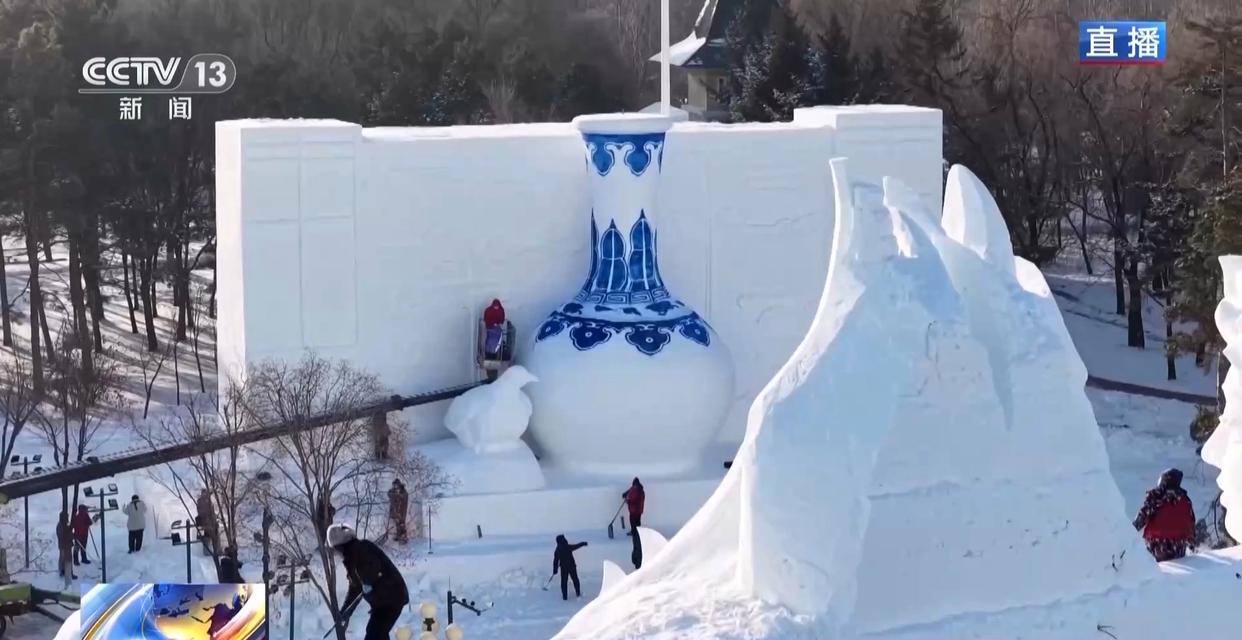 总台记者 于文波:在哈尔滨太阳岛风景区,目前整个园区的建设进度已经完成了85%以上。现场是一片银装素裹的童话世界。我们现在看到的就是主雪雕《点赞中国》。虽然还在进行最后的精雕细琢,但它的恢宏气势已经扑面而来。它的用雪量达到了3万立方米,长103米、宽20米、高33米,相当于十层楼那么高。雪坯上面有近四十位雪雕师正在紧张作业,他们拿着不同的工具,一点点让这个巨作呈现出最终的模样。