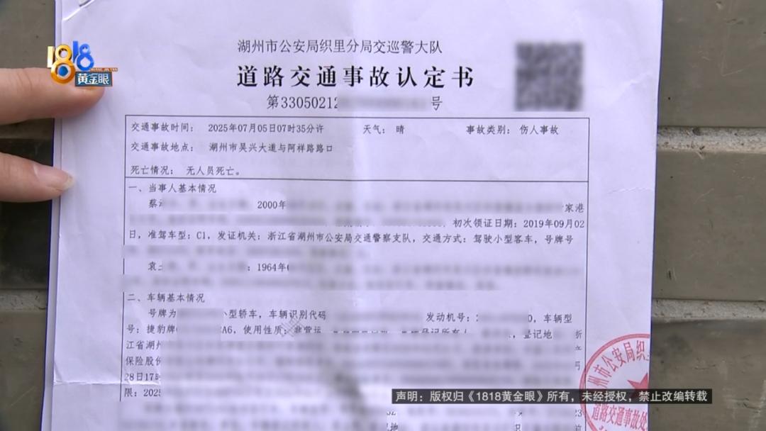 《道路交通事故认定书》显示:“7月5号早上7点35分左右,蔡先生驾驶小轿车途经湖州吴兴区吴兴大道与阿祥路交叉口时,与袁女士父亲驾驶的电动自行车发生碰撞”。