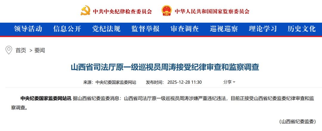 据山西省纪委监委消息:山西省司法厅原一级巡视员周涛涉嫌严重违纪违法,目前正接受山西省纪委监委纪律审查和监察调查。