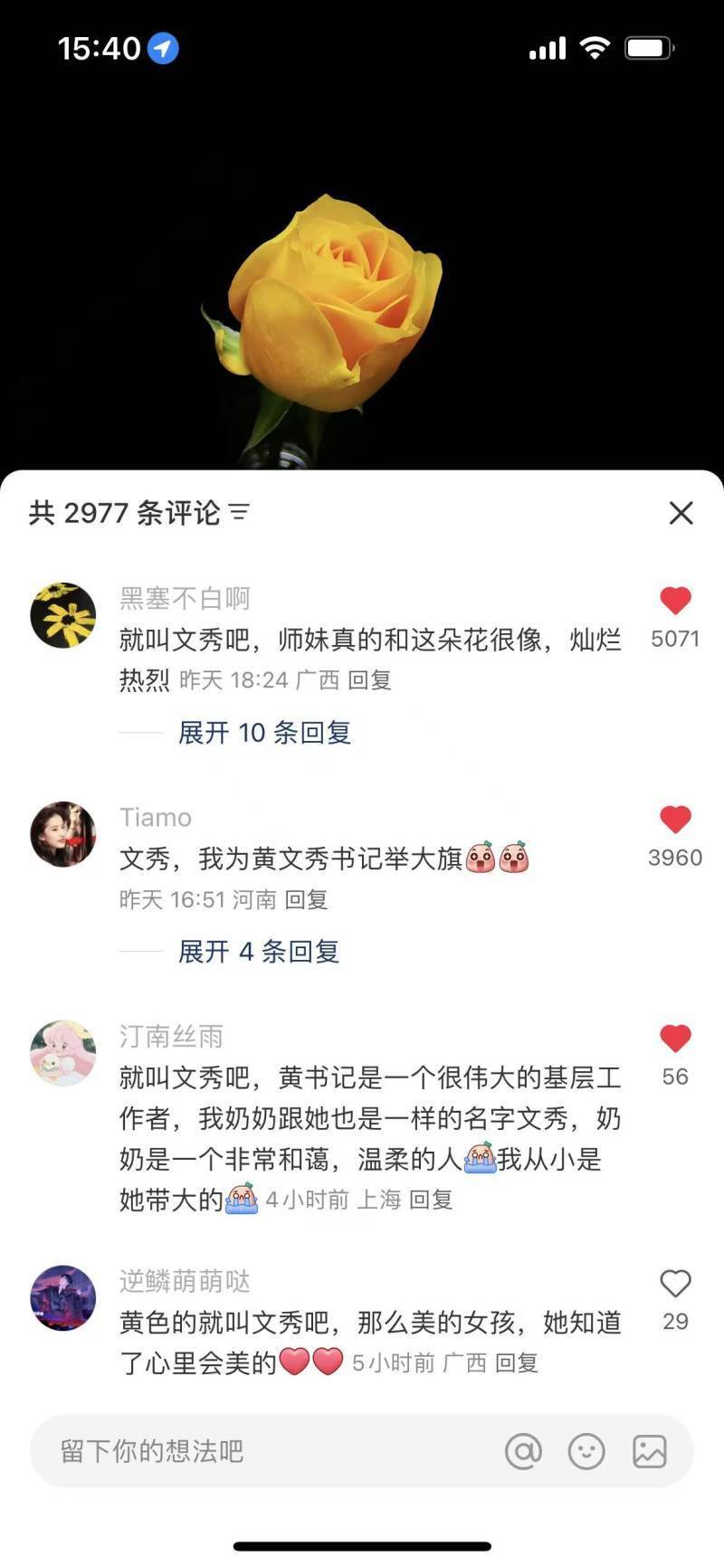早前,一种新品种月季被网友提议冠以其二舅“刘宝华”之名,“宝华月季”最终高票当选。这则温馨的故事23日经上游新闻报道后,意外成为连接大众情感与花卉科学的桥梁并火速升温。受云南省农科院花卉研究所委托,社交账号“植物眼”再次发布新品种月季775-1的征名视频。评论区,最高点赞的五条评论都不约而同地提到了一个名字:文秀。