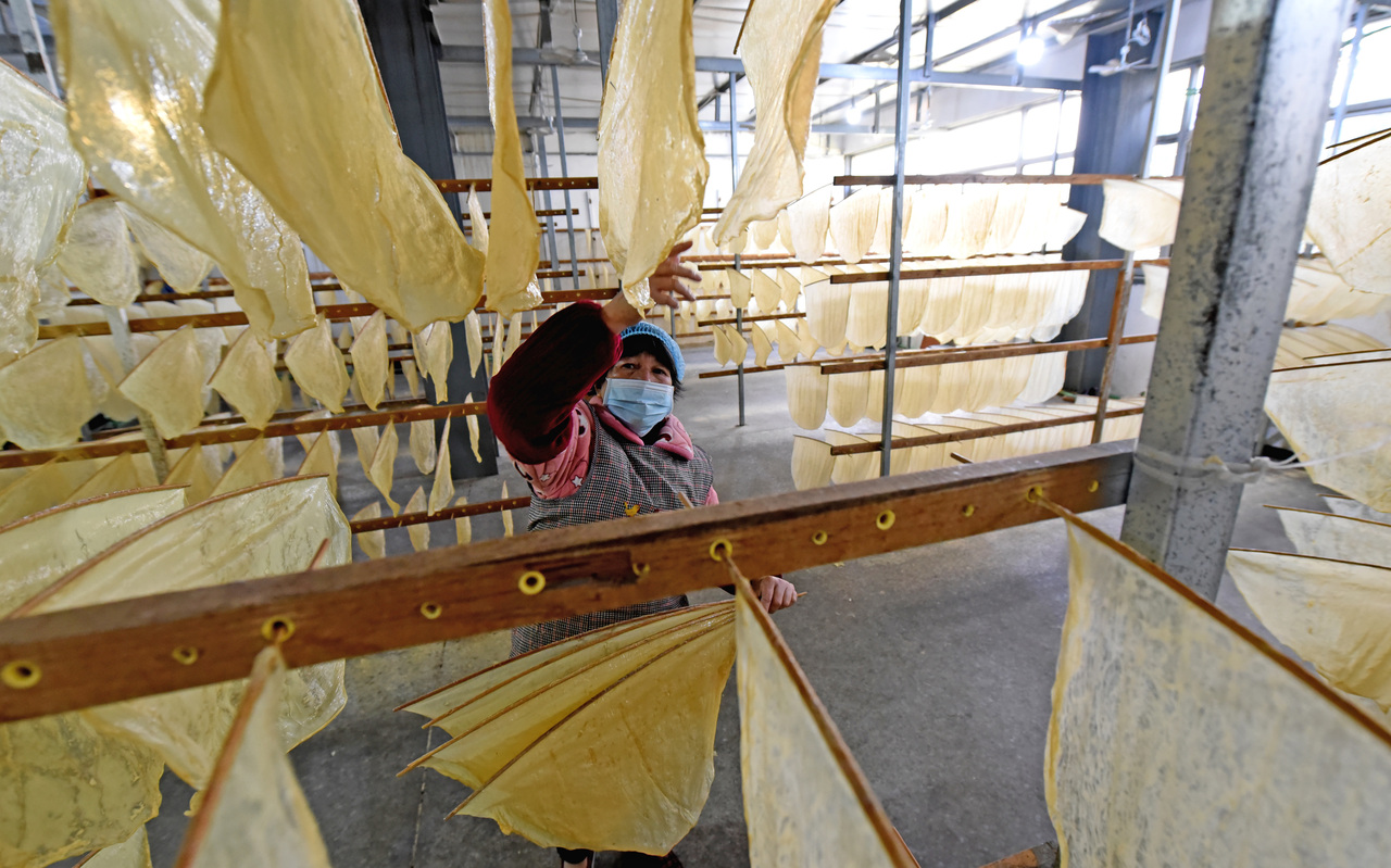 12月27日,仙居县官路镇一家豆腐皮加工企业,工人在烘房内烘干豆腐皮。元旦、春节临近,仙居县各豆腐皮加工企业和作坊迎来了产销旺季,工人们加班加点赶制豆腐皮,供应节日市场。拍友王华斌摄