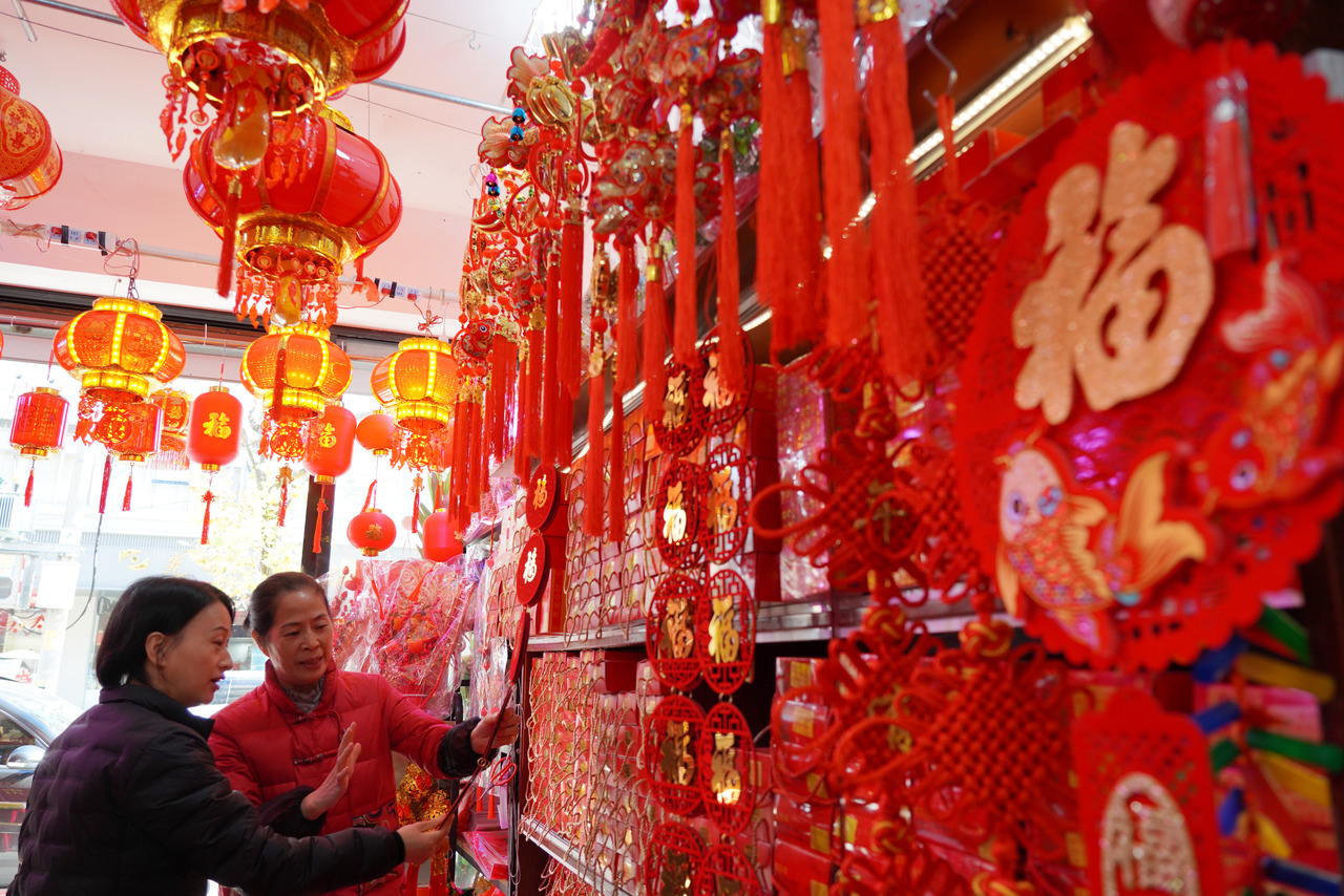 12月27日,市民在乐清市南大街一家饰品销售商铺选购新年饰品。元旦将至,新年饰品销售火热。在乐清市南大街饰品销售商铺,红彤彤的春联、精致的生肖挂件、绚丽的彩灯等饰品琳琅满目,吸引市民驻足挑选。拍友蔡宽元孔丽琴摄