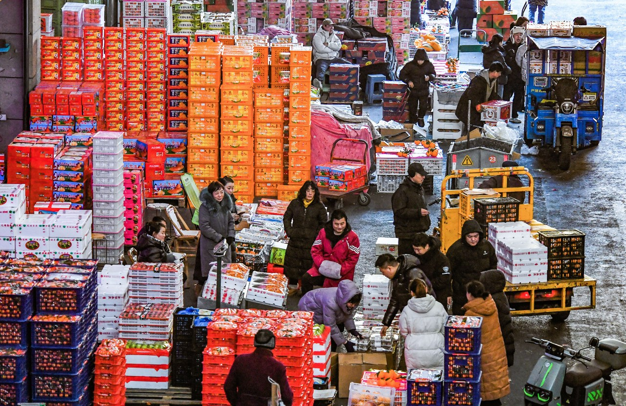 12月28日,金华水果批发市场,柑橘、草莓、蓝莓、车厘子、山竹等各种时令水果堆满了经营户铺面,价格实惠,进货车辆络绎不绝,顾客在挑选各种国产和进口水果,市场里一派繁忙景象。拍友时宽兵摄