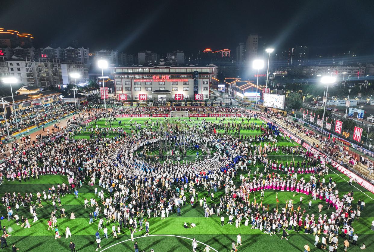 8月23日,人们在贵州“村超”球场跳苗族芦笙舞(无人机照片)