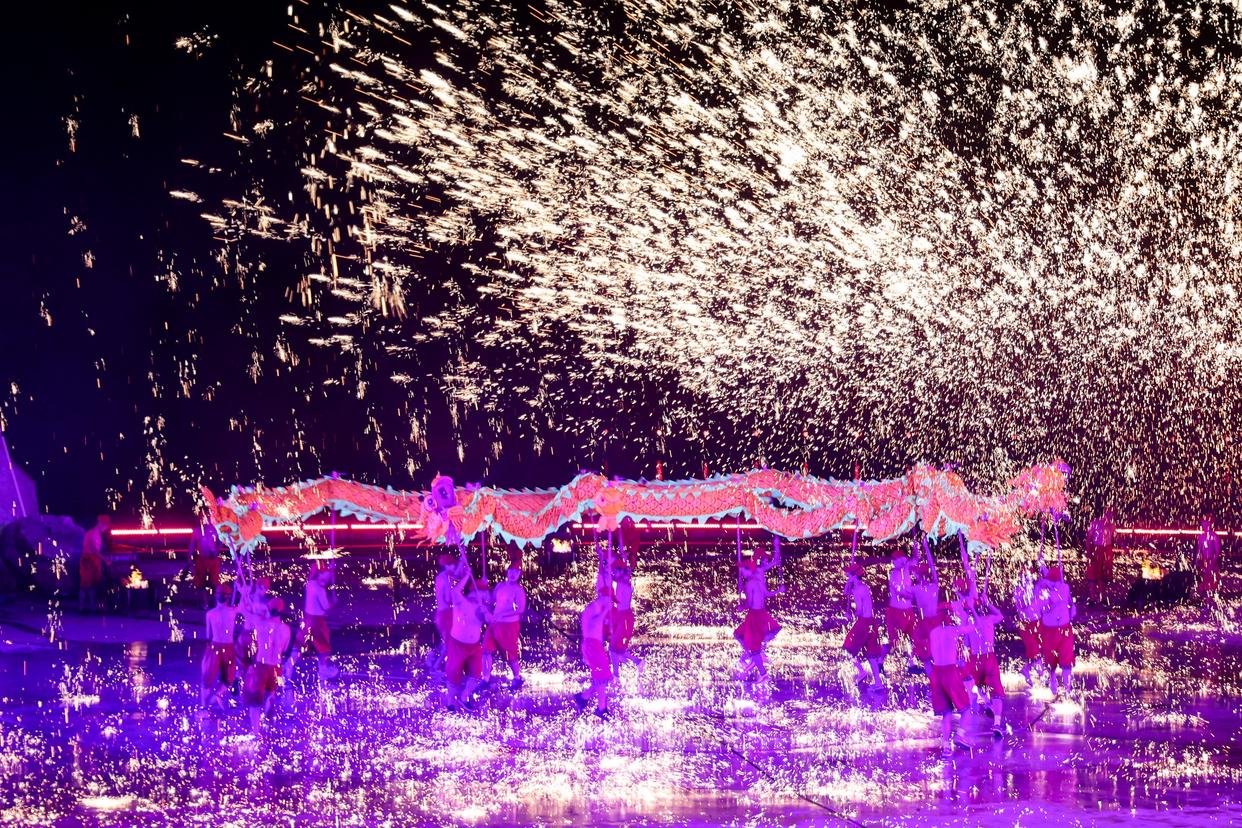 这是12月6日在铜梁区玄天湖龙舞广场拍摄的《追梦·铜梁龙》演出现场。《追梦·铜梁龙》融合水云龙、荷花龙、铁花火龙等多样龙舞。