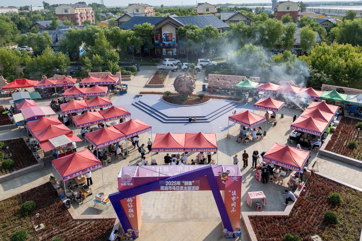这是7月1日在“华夏东极”黑龙江省抚远市拍摄的乌日贡主题活动现场(无人机照片)。