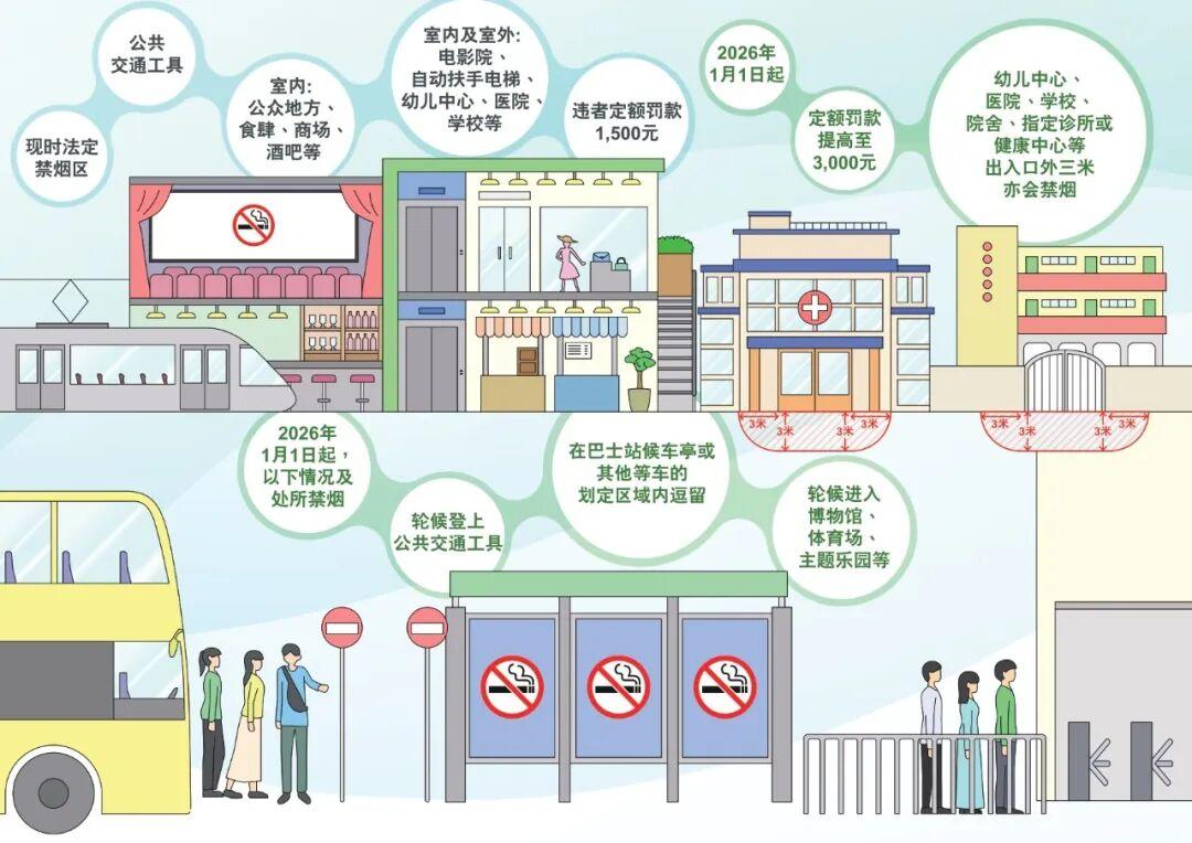 扩大法定禁烟区至幼儿中心、院舍、学校、医院、指明诊所及健康中心的专用出入口3米范围内的公众地方;
