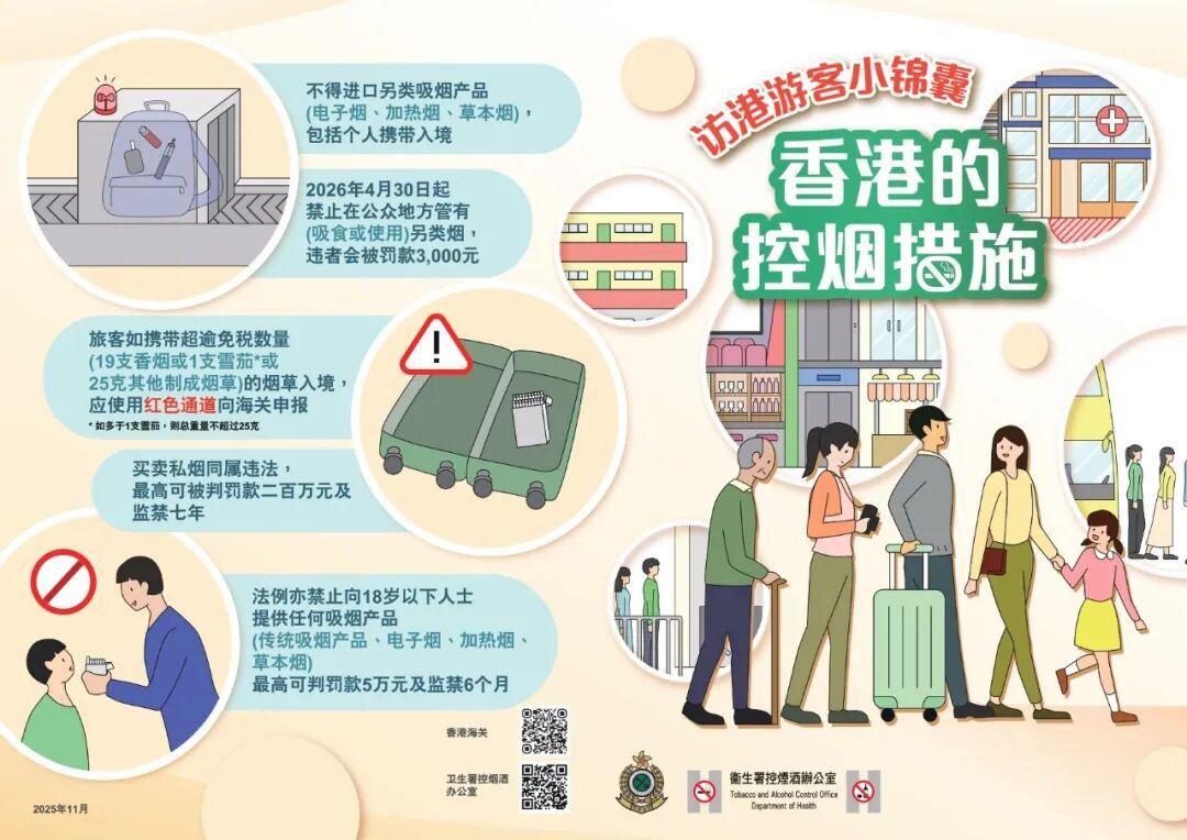 新一阶段控烟措施将分阶段推行,当中提升私烟罚则和禁止向18岁以下人士提供吸烟产品的措施已于9月19日实施。禁止在公众地方管有另类烟用物质(例如电子烟油/烟弹/加热烟支)的法例规定将于2026年4月30日生效。