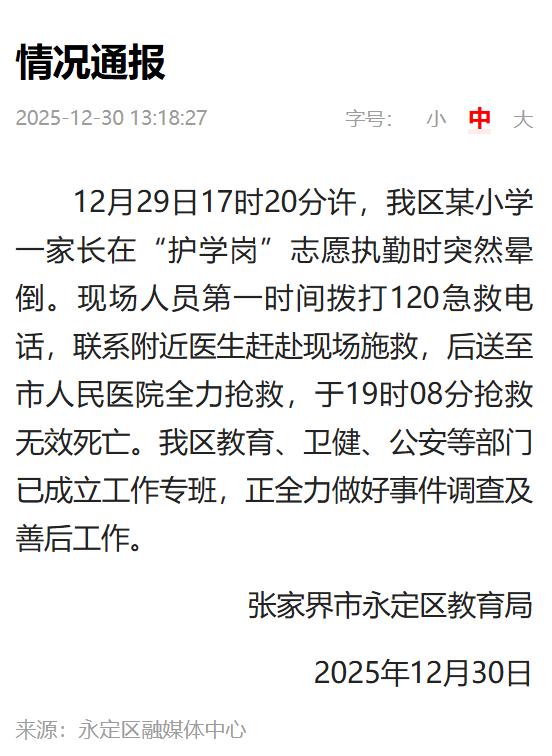 12月29日17时20分许,我区某小学一家长在“护学岗”志愿执勤时突然晕倒。现场人员第一时间拨打120急救电话,联系附近医生赶赴现场施救,后送至市人民医院全力抢救,于19时08分抢救无效死亡。我区教育、卫健、公安等部门已成立工作专班,正全力做好事件调查及善后工作。