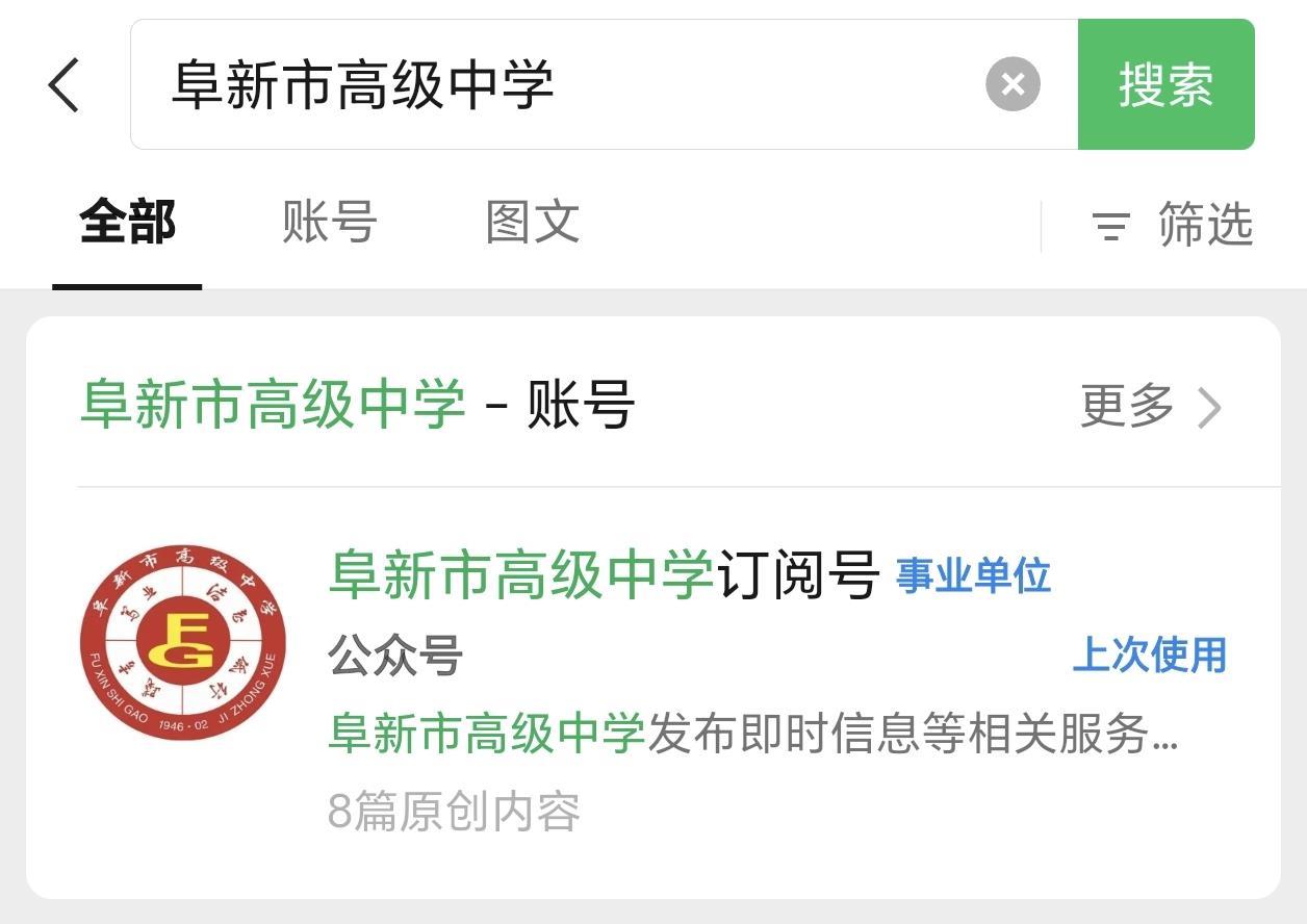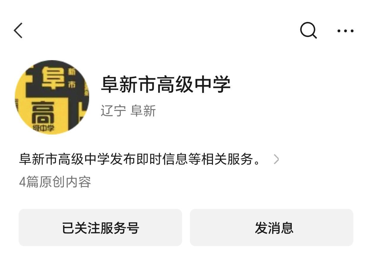 极目新闻记者发现,在这个网站最后的“联系我们”一栏中,还有一个二维码,扫码进入后是一个名为“阜新市高级中学”的公众号,服务号简介为“阜新市高级中学发布即时信息等相关服务”,基础信息一栏中,账号类型为“事业单位”、IP属地为“辽宁”,却没有认证主体。随后记者搜索“阜新市高级中学”发现,出现的第一个账号名称为“阜新市高级中学订阅号”,其后还有蓝色字体的“事业单位”认证,在其基础信息一栏中标识有明确的认证主体,即“阜新市高级中学”。