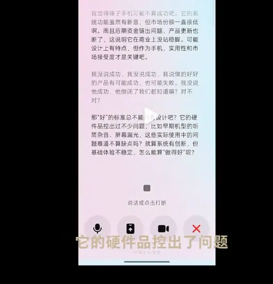 反方豆包则反驳,指出锤子手机存在硬件品控差、续航发热问题突出等硬伤,系统生态不完善,TNT工作站定价高昂且体验未达预期,华而不实,亮点无法掩盖整体短板。