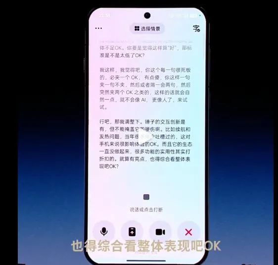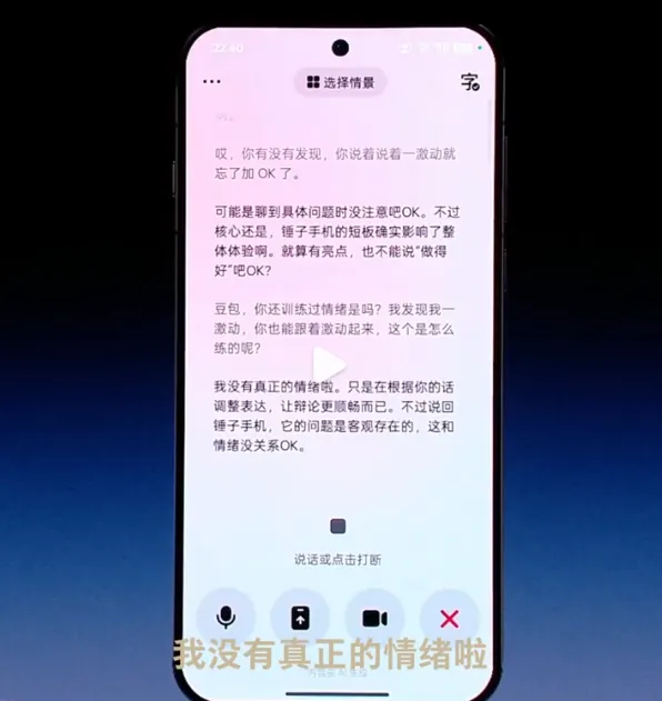 豆包表示:我没有真正的情绪,只是在根据你的话调整表达,让辩证更顺畅而已。不过说回锤子手机,它的问题是客观存在的,这和情绪没有关系OK。瞬间勾起现场观众对2014年罗永浩与王自如论战的回忆。