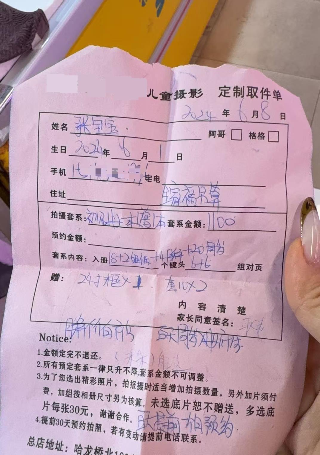据极目新闻此前报道,2024年6月1日,她生完二胎女儿后在吉林市一家月子中心坐月子,一家儿童摄影店上门免费为宝宝拍摄了月子照,耿女士经过对方游说额外购买了一套价值1100元的百天照加周岁照套册,此后待拍百日照时因各种原因一再延后。2024年12月时她的小女儿被医院诊断出了小脑肿瘤,2025年4月25日由于小女儿病情太重,最终经抢救无效离开了她。近日她清理小女儿的遗物时发现了该儿童摄影店开具的收据,对方在和她线上沟通时表示,耿女士预订的套餐是活动套餐,而且单据上写明了定完不退,还称“你家孩子老大是可以拍的”。这样的话语让耿女士无法接受:“我的小女儿都没了,她还说这样的话,我感到很受刺激。”