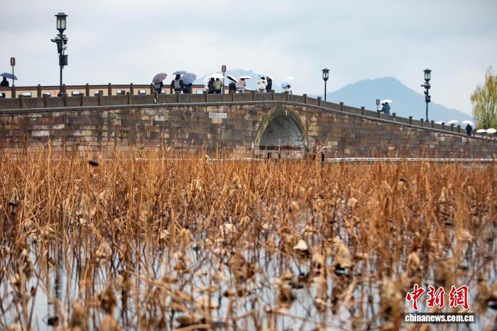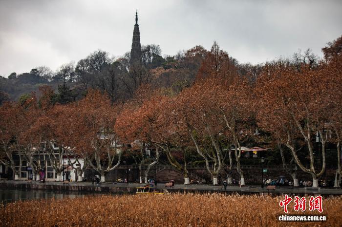 1月1日,冬日西湖残荷与远处保俶塔交相辉映。新年伊始,2026年第一场烟雨入江南,杭州西湖风景如画。 中新社 记者 吴君毅 摄