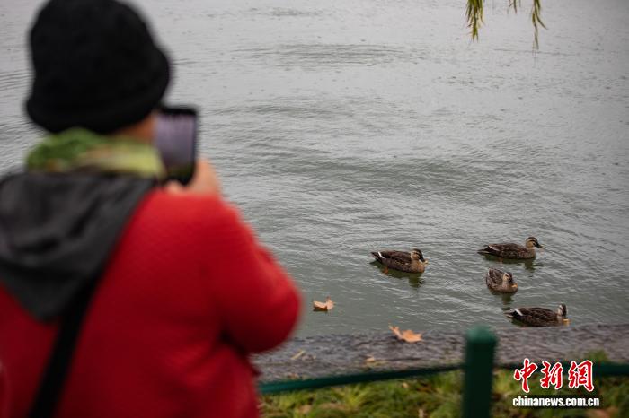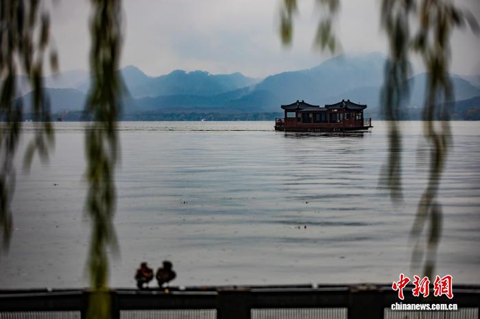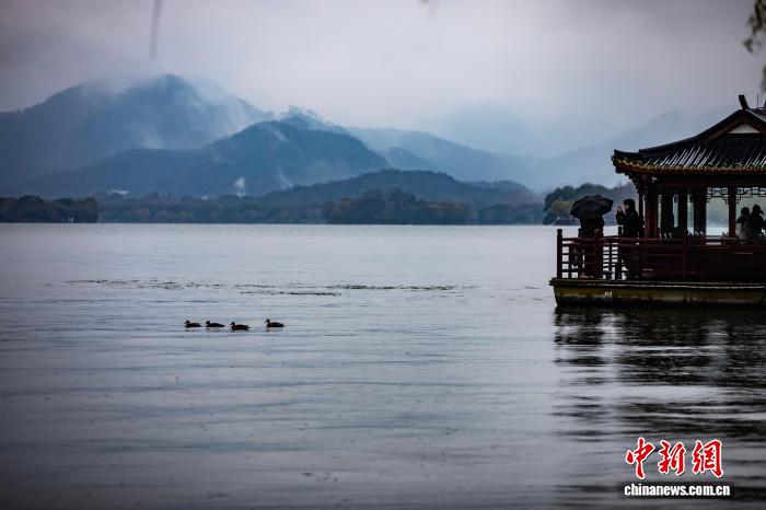 1月1日,游客在西湖边记录风景。新年伊始,2026年第一场烟雨入江南,杭州西湖风景如画。 中新社 记者 吴君毅 摄