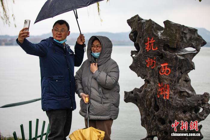 1月1日,游客在西湖边拍照留念。新年伊始,2026年第一场烟雨入江南,杭州西湖风景如画。 中新社 记者 吴君毅 摄