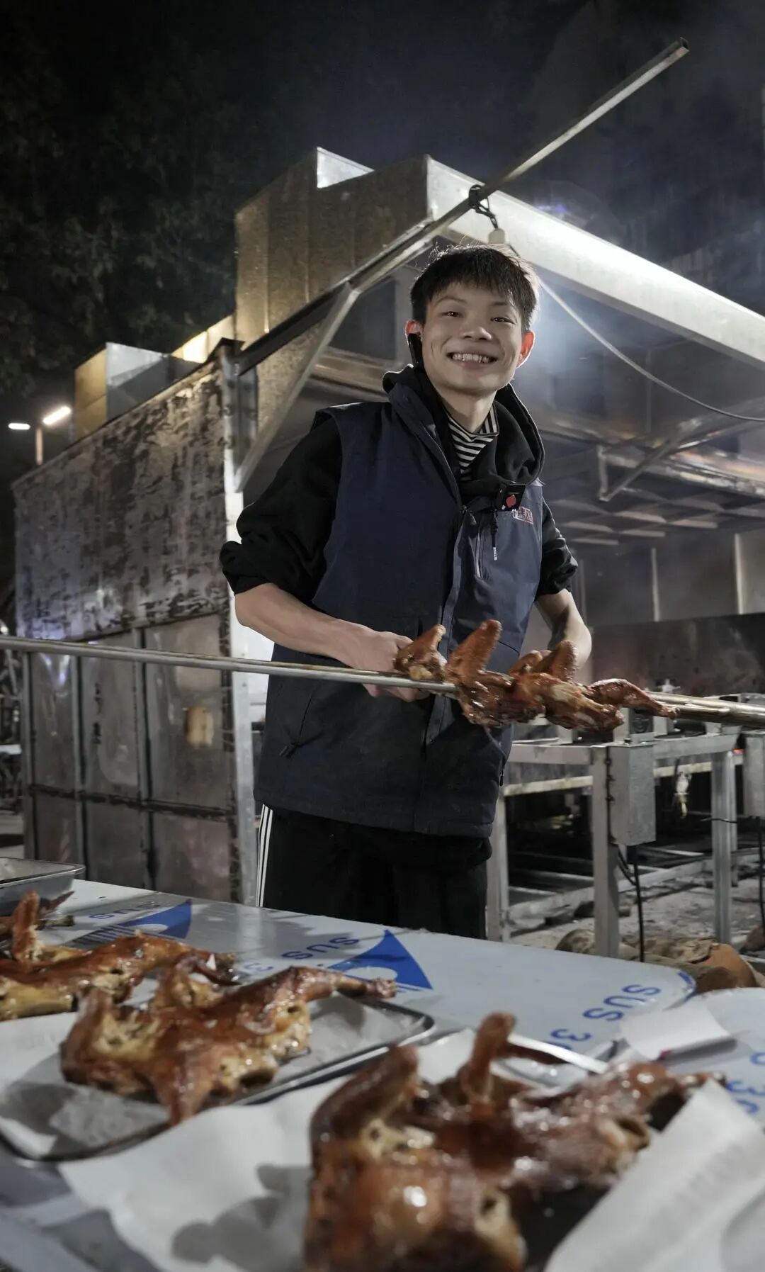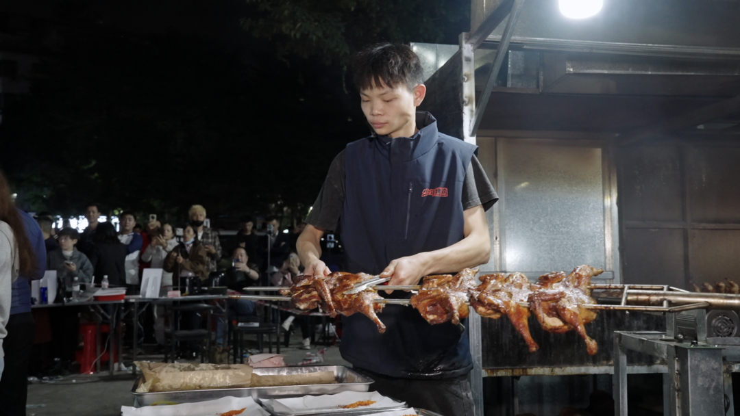 凌晨一点半,烤炉区的热浪扭曲着灯光。小陈的大哥翻转着钢叉,烤鸡在火光中均匀转动。“很热,三四百摄氏度,跟蒸桑拿差不多。我们就在深圳附近,看他一个人搞太辛苦,过来帮一下。”