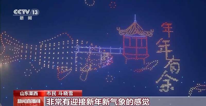 在山东莱西市,1500架无人机以深邃的夜空为幕布,精准编队、灵动变幻,依次呈现出“元旦快乐”“龙腾盛世”“凤舞神州”“骏马奔腾”等字样和图案,市民游客纷纷用手机记录下这美好图景。
