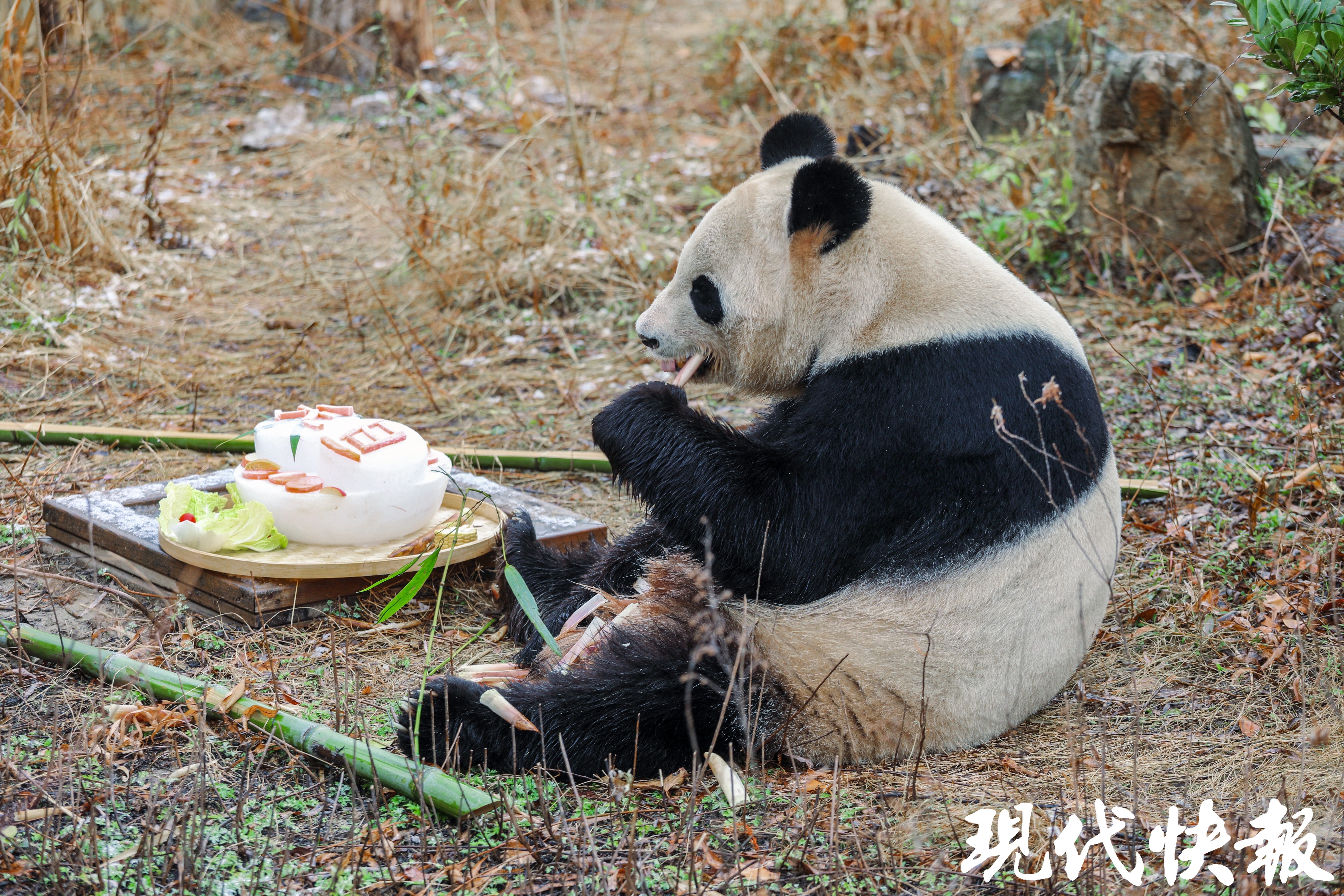 现代快报讯(通讯员曹菁琳倪雯记者花宇)2026年元旦清晨,南通飘起小雪,南通森林野生动物园为大熊猫“星辉”“星繁”兄妹,准备了冰胚“新年蛋糕”,蛋糕上放置竹笋、苹果、玉米,还用胡萝卜雕出“元旦”二字。