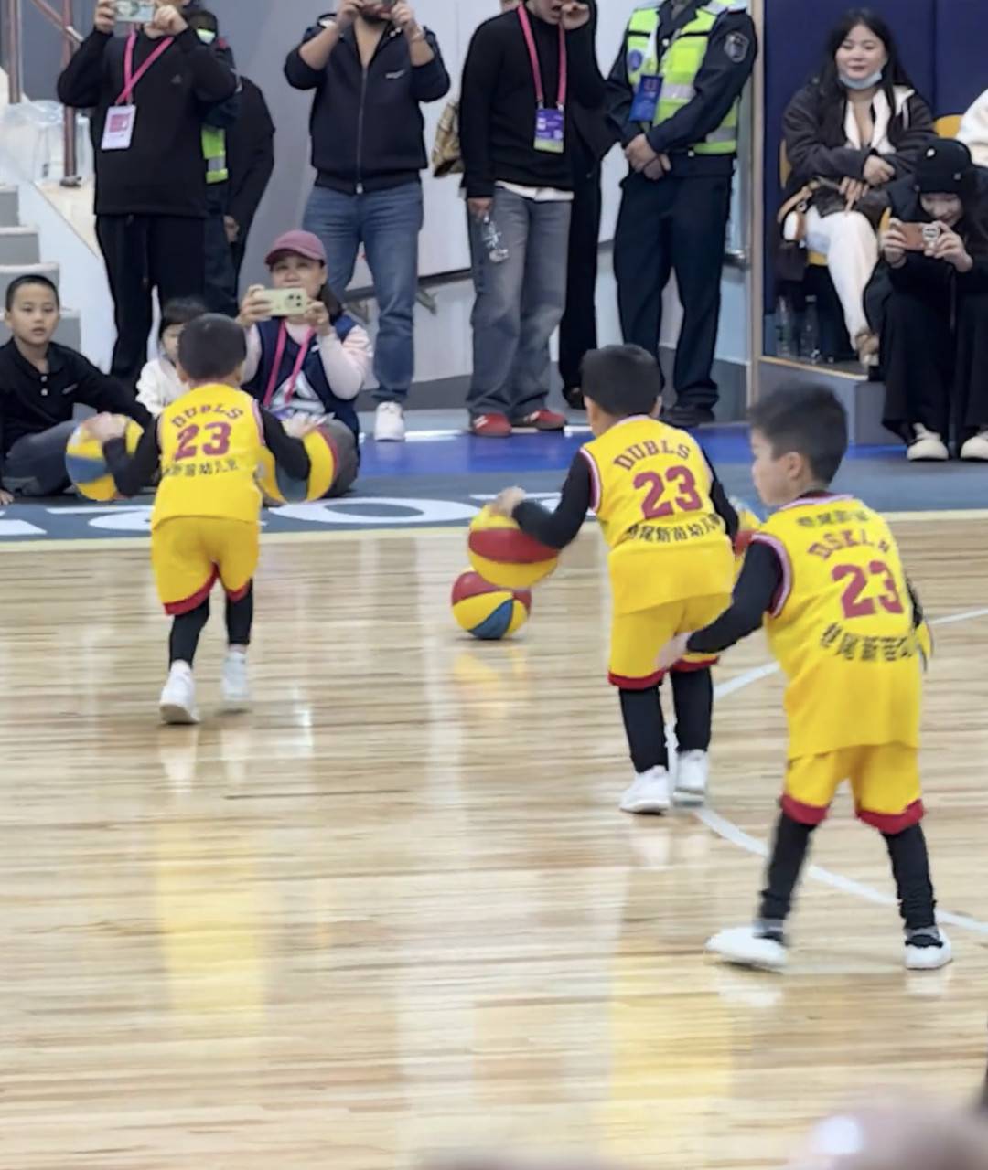 这段视频拍摄于12月28日,WCBA女篮比赛中场表演环节,记录了16名幼儿园大班小朋友进行花样篮球表演的全过程。