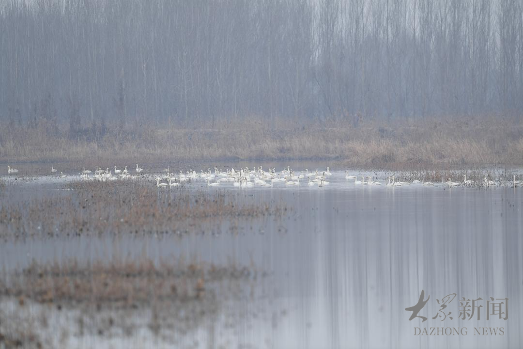 2026年新年第一天清晨8点,微山湖上的薄雾尚未散尽,100多只白天鹅飞抵高楼乡王楼湿地,成为新年灵动的“吉祥信使”。