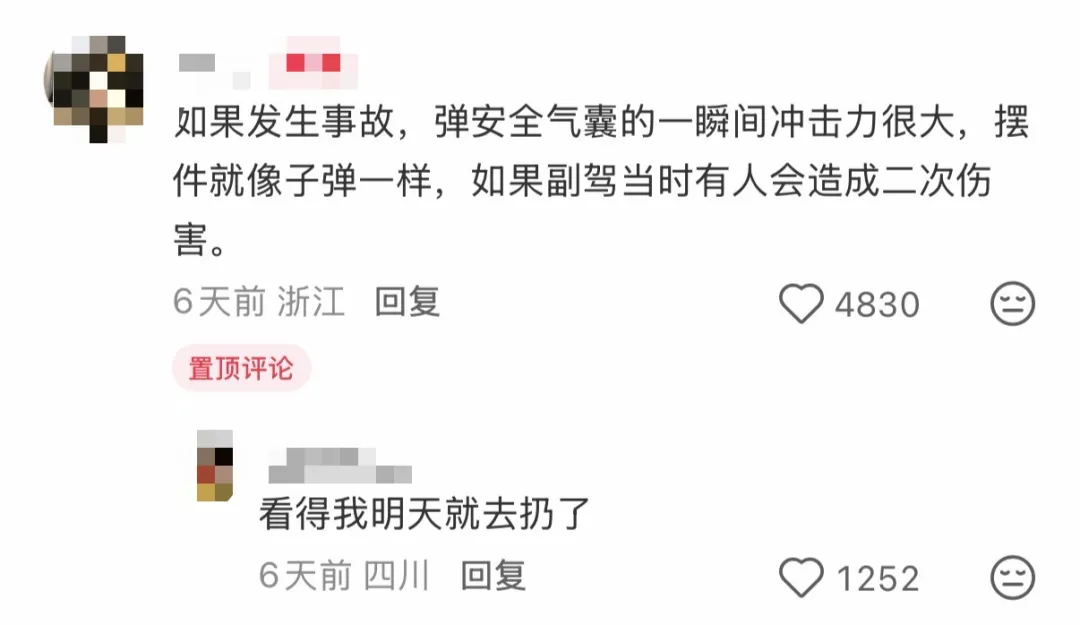 这位网友还在评论区补充说:如果发生事故,弹安全气囊的一瞬间冲击力很大,摆件会像子弹一样,给车里的人造成伤害。
