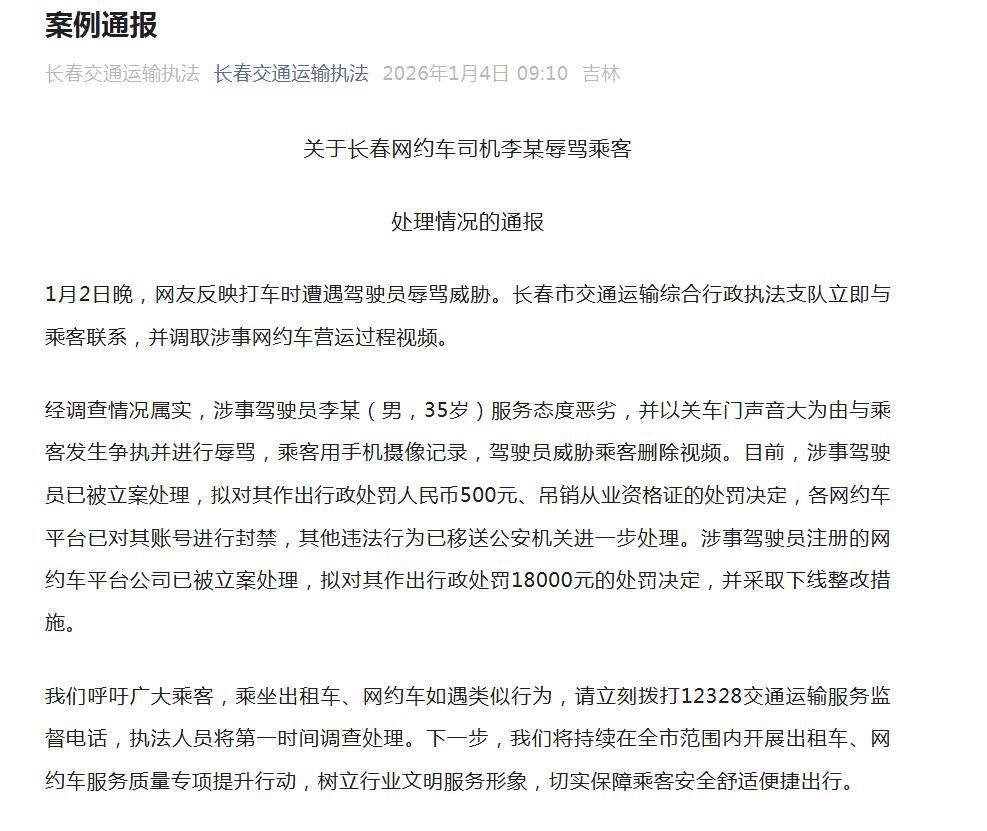 1月2日晚,网友反映打车时遭遇驾驶员辱骂威胁。长春市交通运输综合行政执法支队立即与乘客联系,并调取涉事网约车营运过程视频。