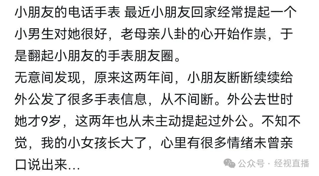这位母亲表示,自己在翻女儿电话手表时,无意间发现女儿断断续续给外公发了很多信息,她感慨道:“我没想到,她内心深处对外公的感情这么深”。