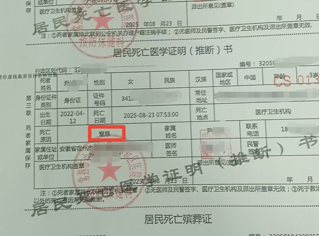 尹先生提供的死亡医学证明显示,其女儿直接死亡原因为窒息。