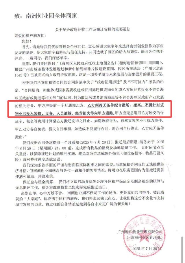 据了解,该地块的动荡始于2025年7月。根据广州市海珠区人民政府发布的征收土地预公告,该地块被纳入广州新中轴海珠片区改造范围。随后,地块出租方“广州市海珠区南洲街三滘第三、第四经济合作社”及物业管理者“广州迎和物业管理有限公司”等,向园区内租户发出了搬迁通知。