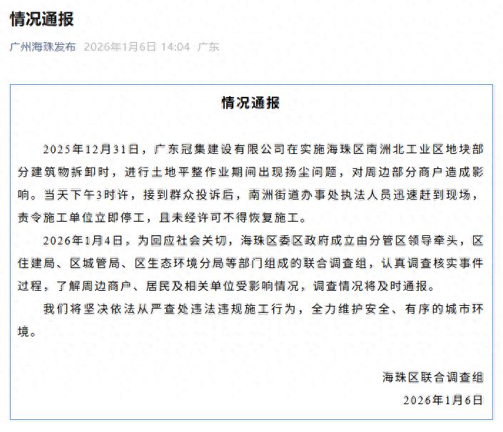 2026年1月4日,为回应社会关切,海珠区委区政府成立由分管区领导牵头,区住建局、区城管局、区生态环境分局等部门组成的联合调查组,认真调查核实事件过程,了解周边商户、居民及相关单位受影响情况,调查情况将及时通报。