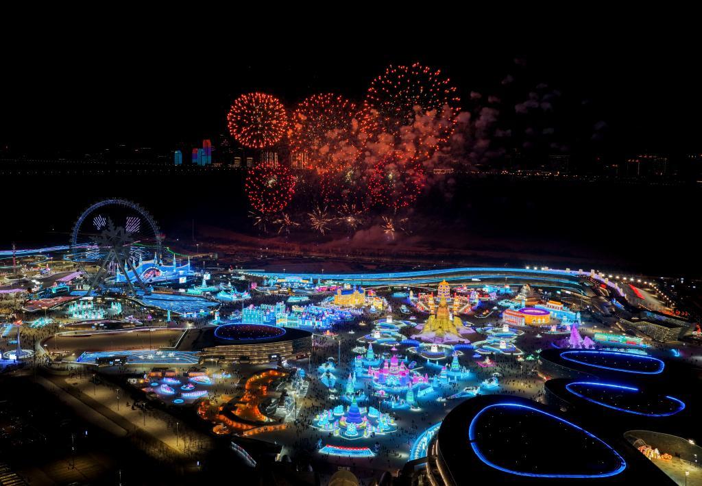 这是1月5日拍摄的哈尔滨冰雪大世界烟花秀(无人机照片)。新华社记者 王松 摄