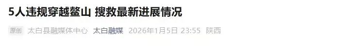 据“太白融媒”消息,5人违规穿越鳌山4人失联,搜救最新进展情况公布: