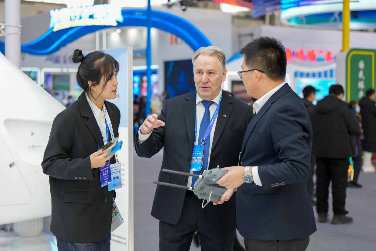 1月6日,在2026哈尔滨国际冰雪经济博览会展会现场,参会嘉宾(中)在了解一款工业无人机的参数和性能。新华社记者 王松 摄
