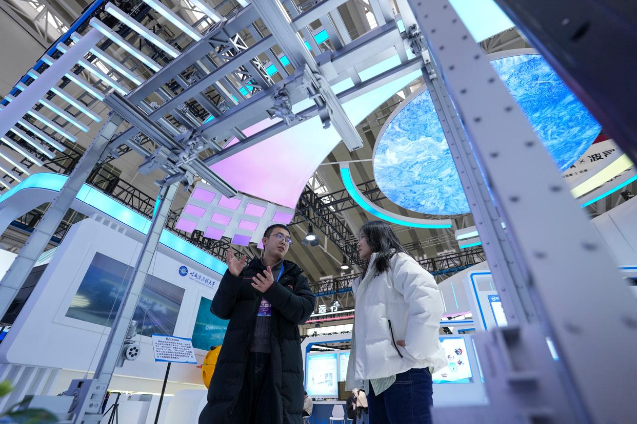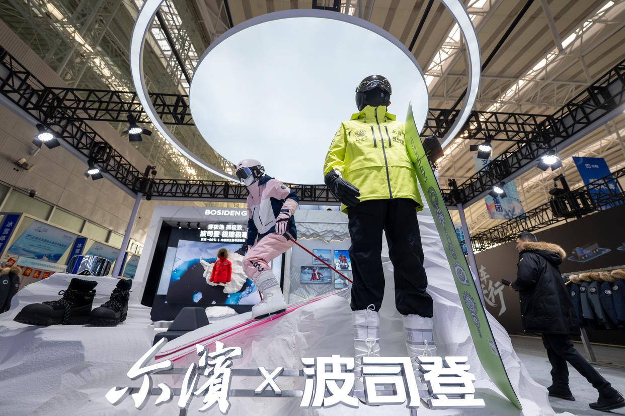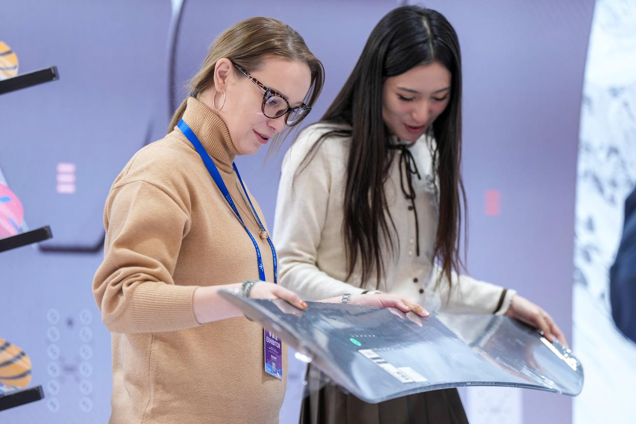 1月6日,在2026哈尔滨国际冰雪经济博览会展会现场,参会嘉宾(左)为参观者介绍智能碳纤维滑雪板性能。新华社记者 王松 摄