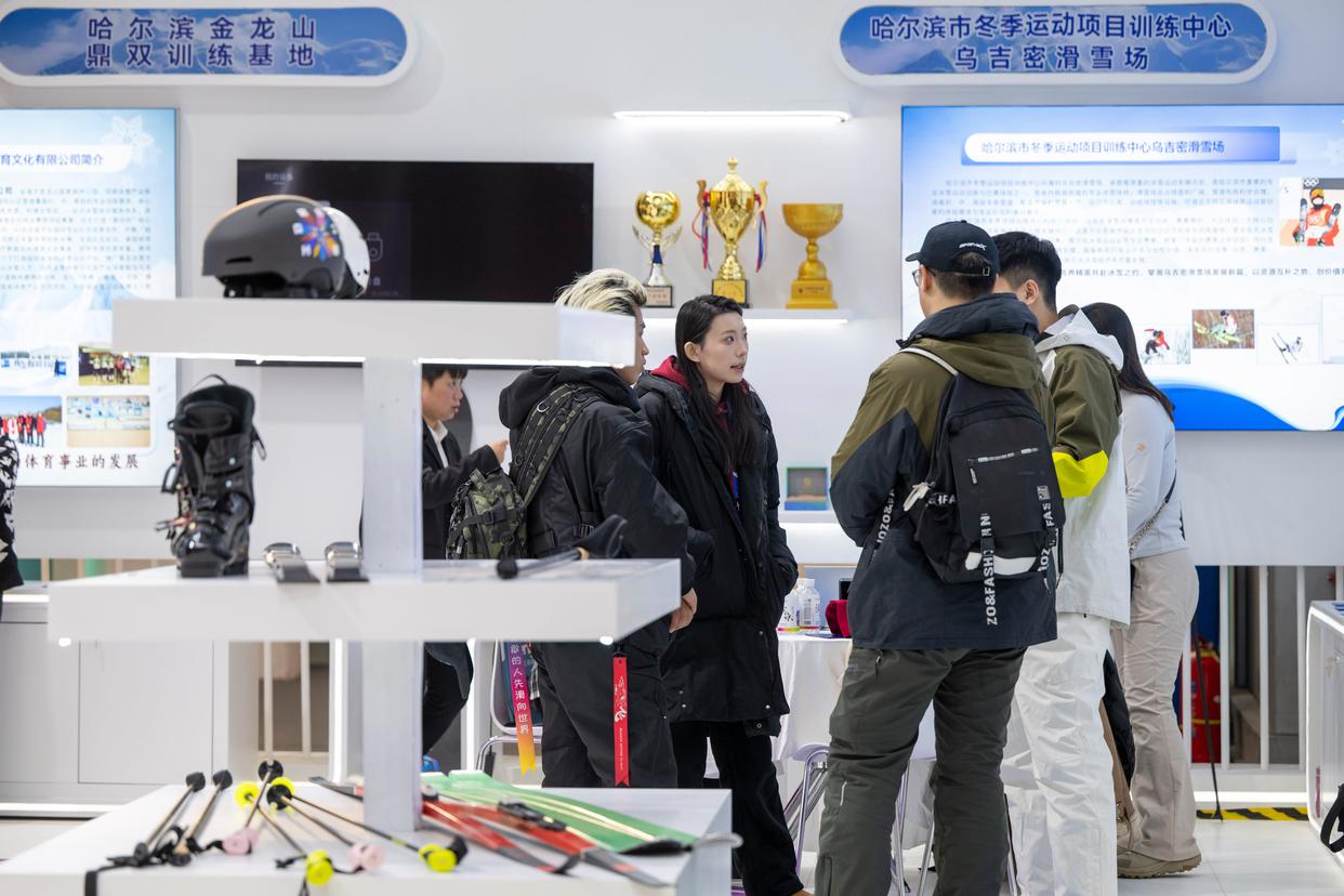 1月6日,在2026哈尔滨国际冰雪经济博览会展会现场,参观者在咨询一款碳纤维滑雪板性能。新华社记者 王松 摄