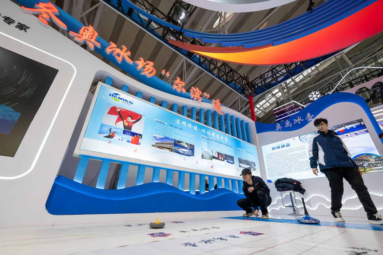 1月6日,参观者在2026哈尔滨国际冰雪经济博览会现场体验冰壶运动。新华社记者 张涛 摄