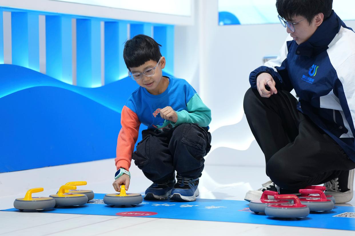 1月6日,在2026哈尔滨国际冰雪经济博览会展会现场,小朋友体验投掷冰壶。新华社记者 王松 摄
